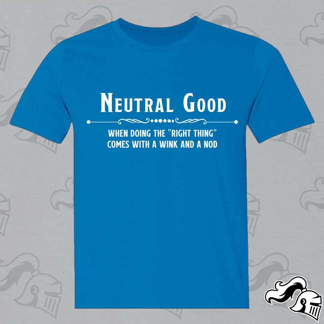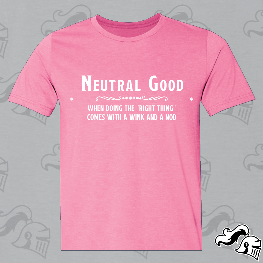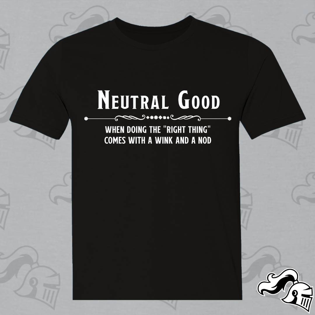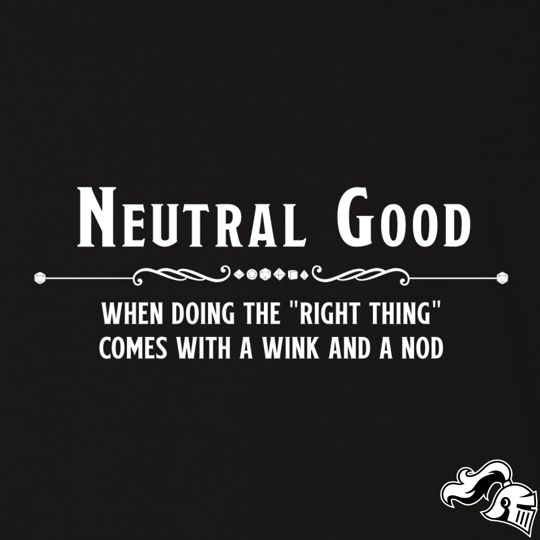 Embrace the subtle heroics of our 'Neutral Good' tee! Because sometimes, doing the 'right thing' comes with a wink and a nod. Whether you're bending the rules or blazing your path, this tee lets you showcase your goodness with a touch of charm and a whole lot of heart!