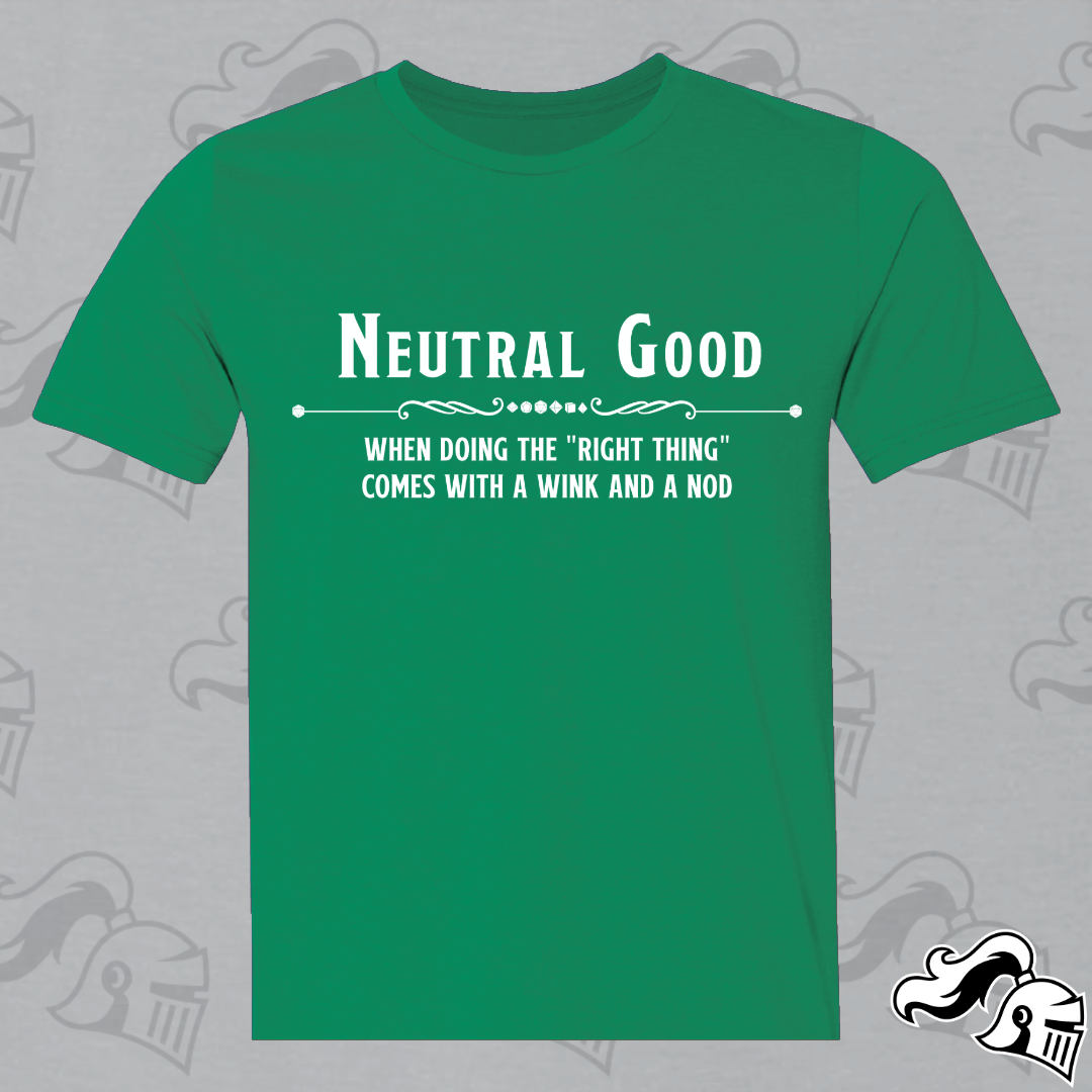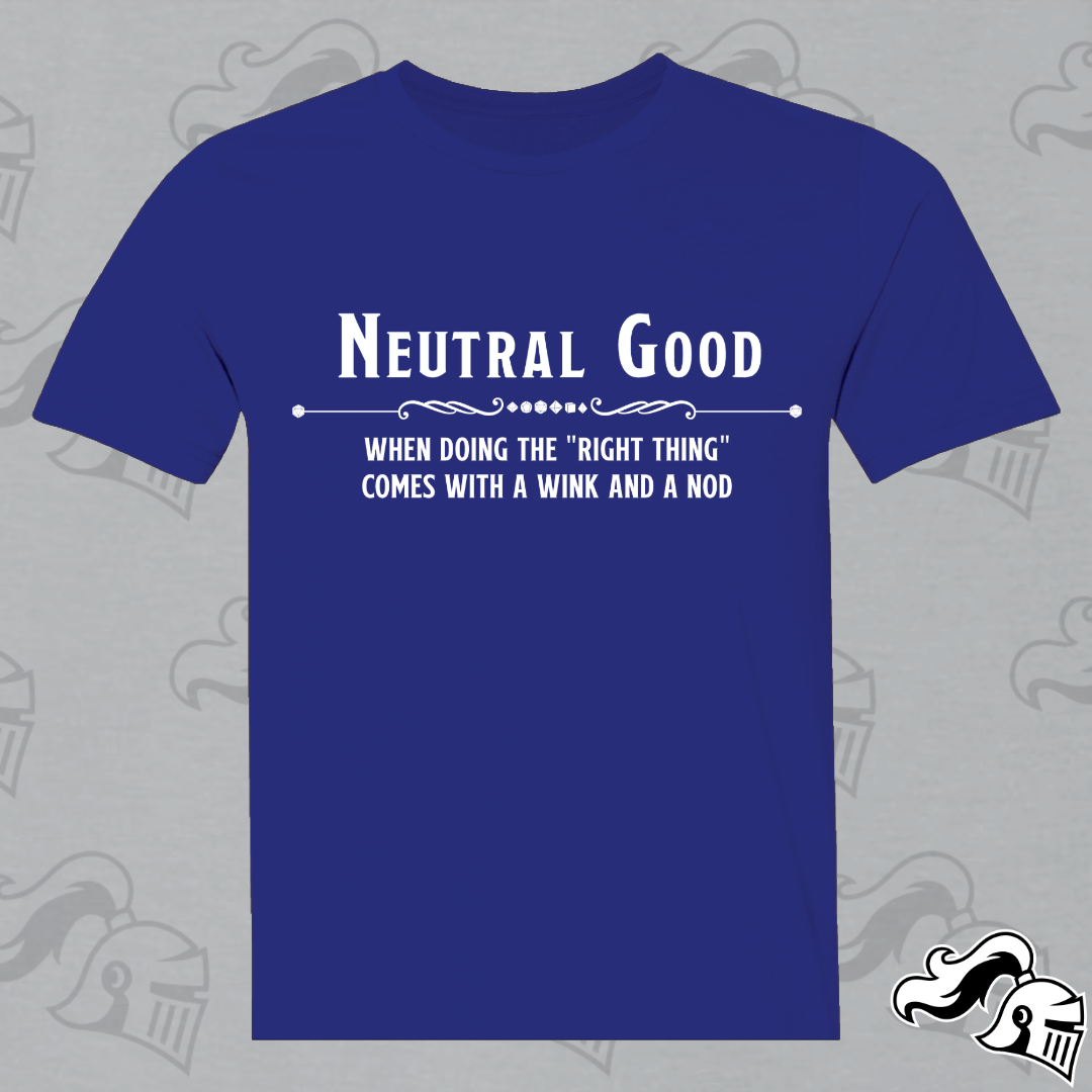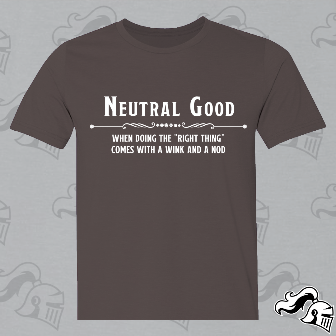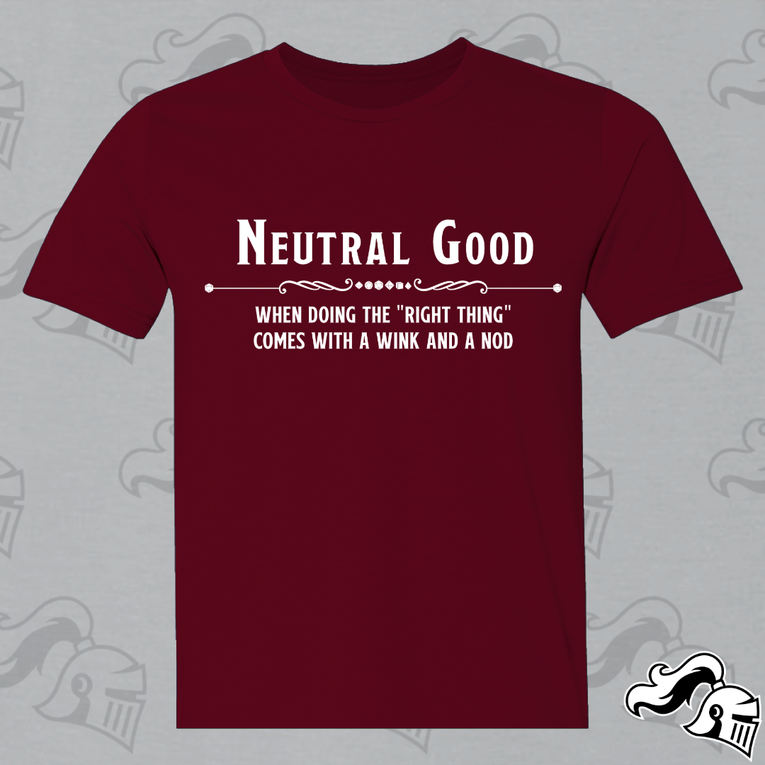 Embrace the subtle heroics of our 'Neutral Good' tee! Because sometimes, doing the 'right thing' comes with a wink and a nod. Whether you're bending the rules or blazing your path, this tee lets you showcase your goodness with a touch of charm and a whole lot of heart!
