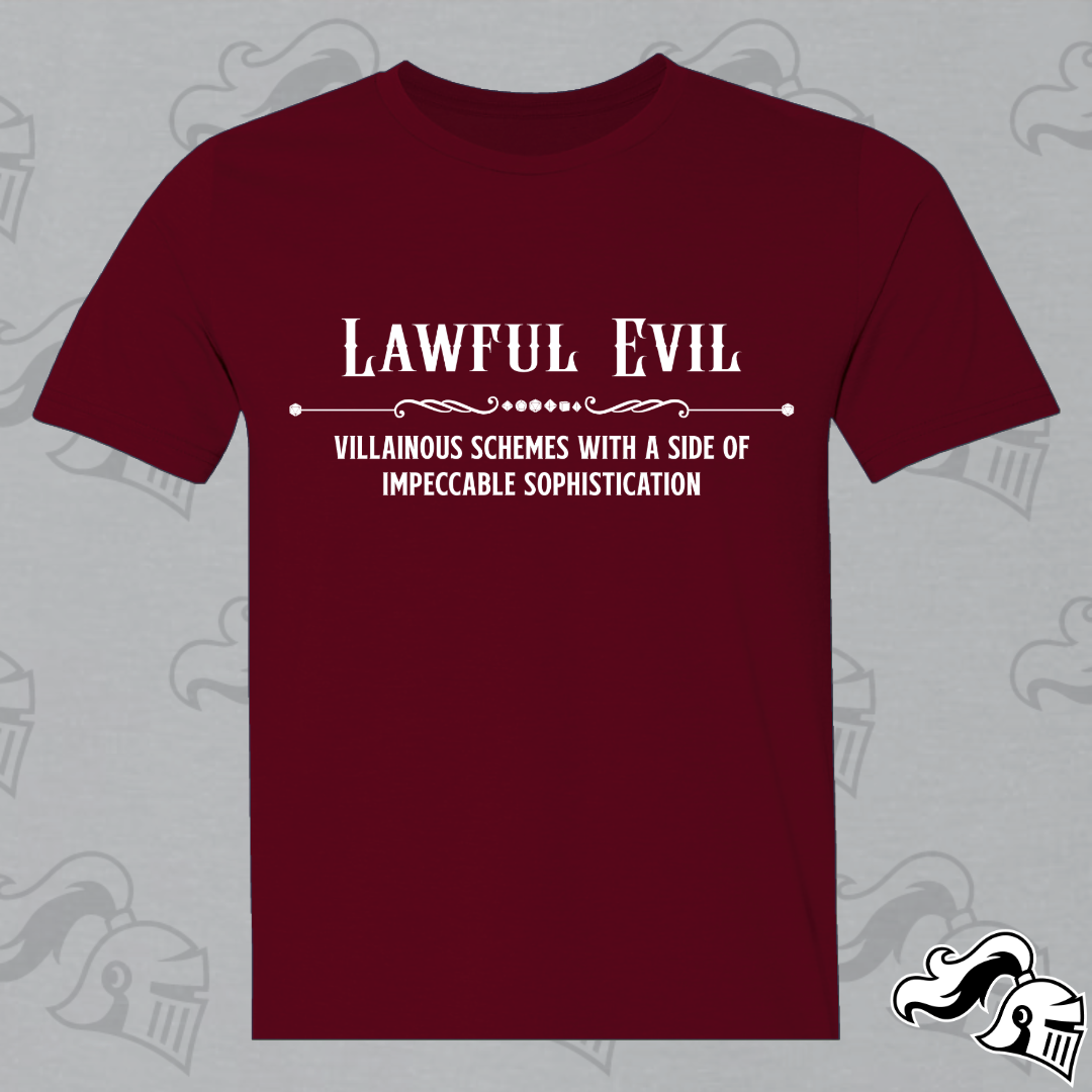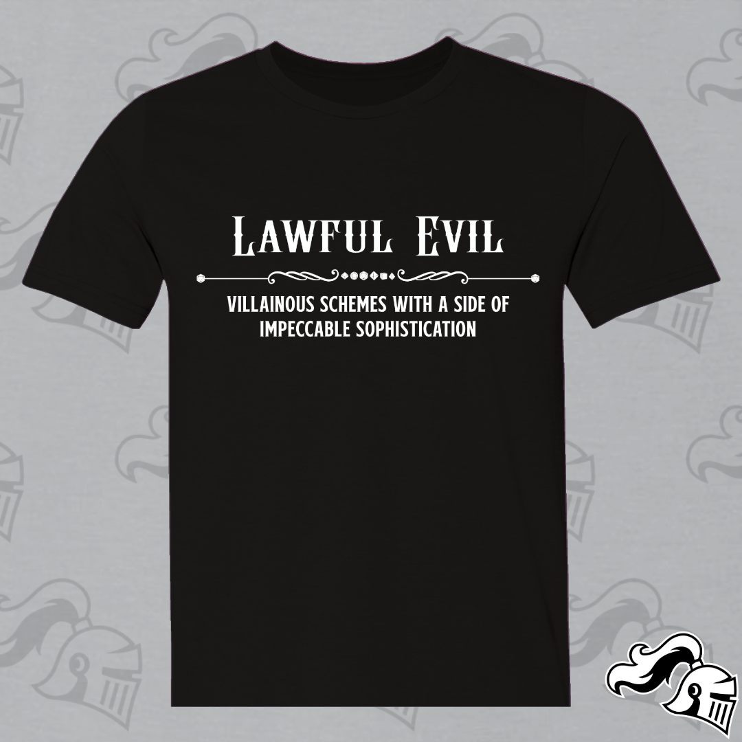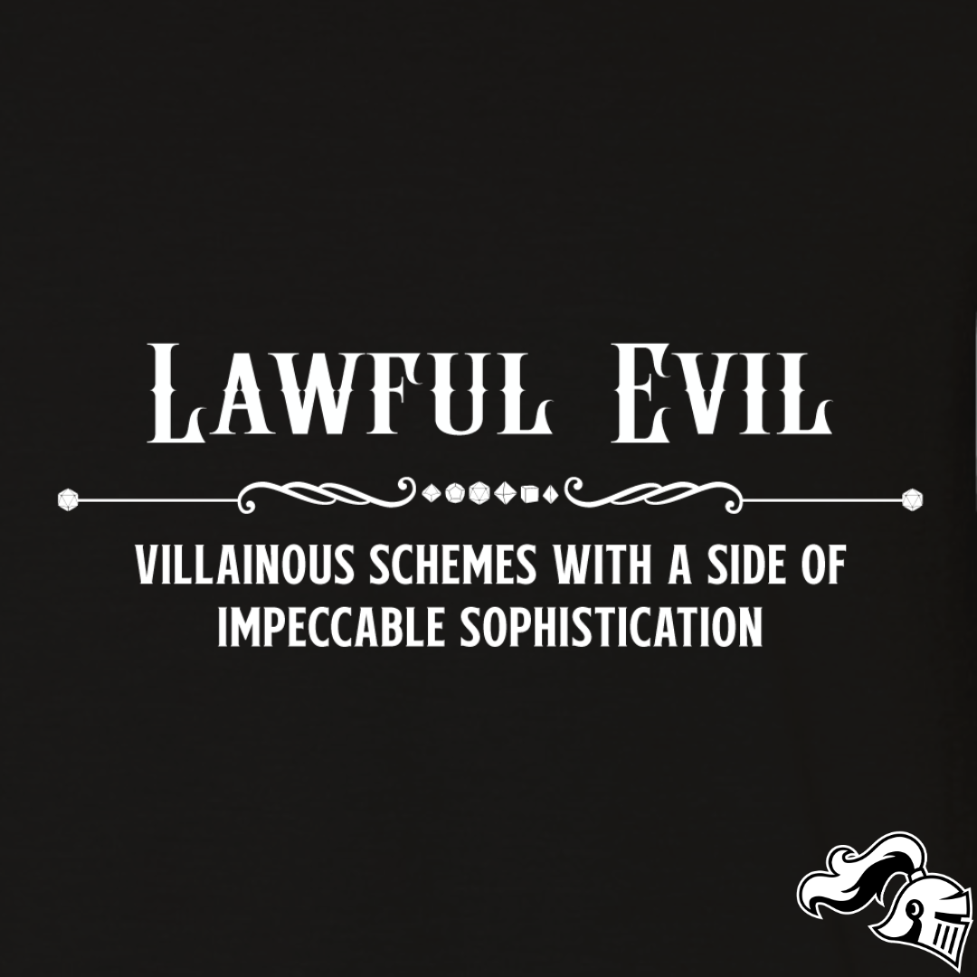 Embrace your inner villain with our 'Lawful Evil' tee! Because who says evil can't be sophisticated? From dastardly plots to impeccably tailored attire, this tee lets you showcase your nefarious style with a touch of class. Rule the realm with an iron fist and a sense of refinement!