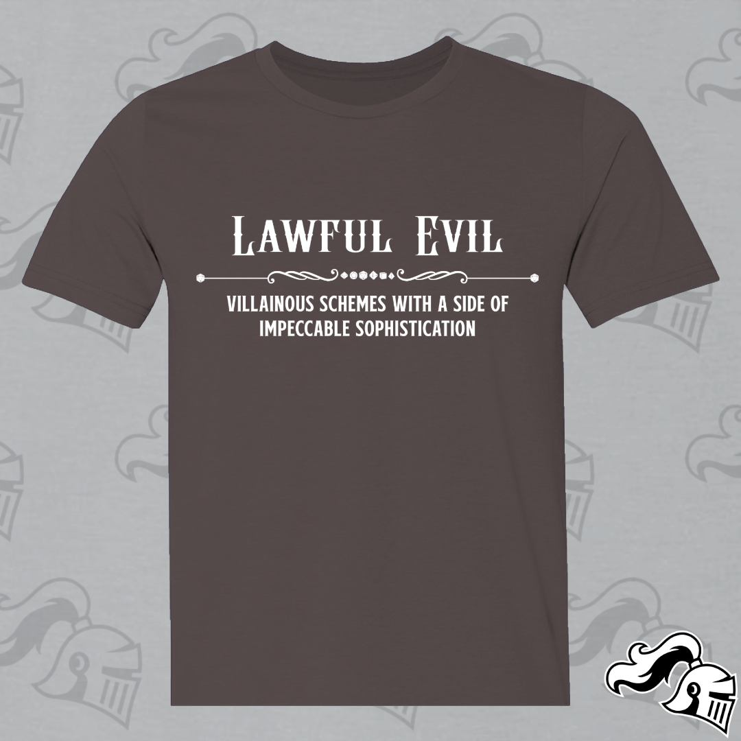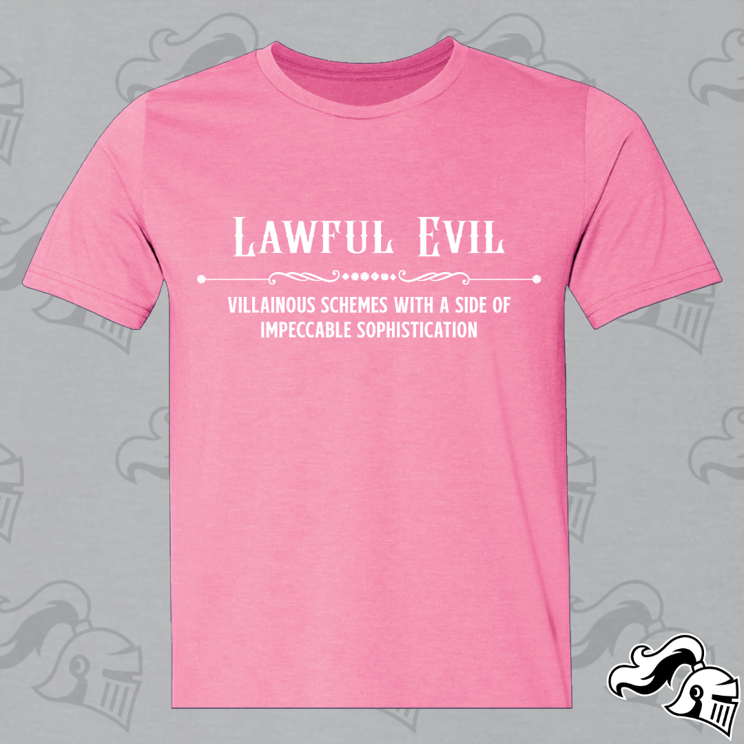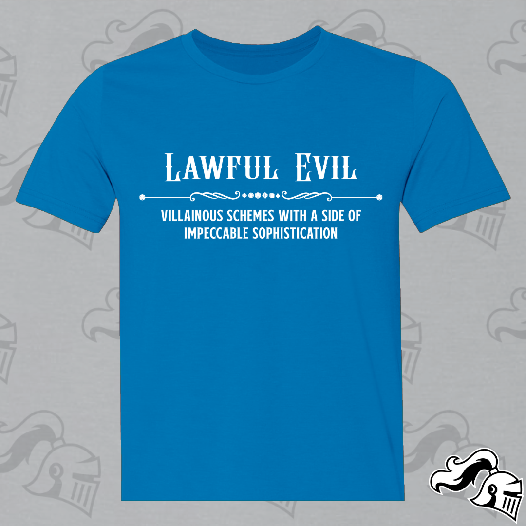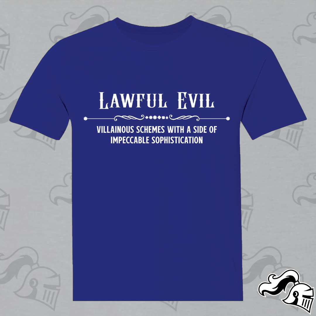 Embrace your inner villain with our 'Lawful Evil' tee! Because who says evil can't be sophisticated? From dastardly plots to impeccably tailored attire, this tee lets you showcase your nefarious style with a touch of class. Rule the realm with an iron fist and a sense of refinement!